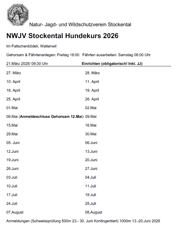 Hundeausbildung Hundekurs 2026Wir gratulieren unseren Gespannen zur bestandenen Schweissprüfung! Walter mit Dex Simon mit Zorro Michael mit Mila Hansueli mit Gora Godi mit Roy Wir gratulieren unseren drei Prüflingen zur bestandenen Gehorsamsprüfung! Godi mit Roy Nadine mit Daro Kobi mit Isidor